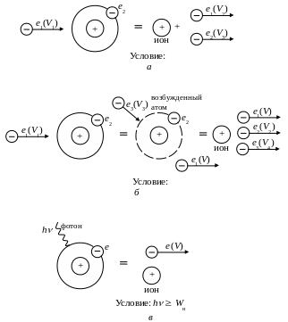 Ударная ионизация – образование иона при соударении электрона с нейтральными атомом или молекулой (рис. 1.2, а).