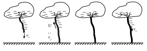 Рис. 1.9. Схема разряда молнии: а – первый лидер идет к земле со скоростью v1; б – волна возвратного удара идет вверх со скоростью v2; в – произошел внутриоблачный пробой от канала возвратного удара на левую часть облака; г – второй лидер движется со скоростью v3 по частично распавшейся плазме искрового канала