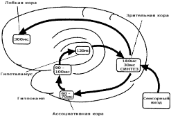 В последнее время при обсуждении нейрофизиологических основ сознания большое внимание уделяется высокочастотной биоэлектрической активности мозга (Данилова, 1998). Ведущая роль в возникновении сознания приписывается высокочастотным составляющим спектра ЭЭГ в диапазоне от 35 Гц до 120 Гц. Сознание определяют как продукт синхронизации нейронной активности в указанном частотном диапазоне. Предполагается, что когерентная электрическая активность достаточно большого числа нейронов создает необходимое и достаточное условие для явления сознания даже в отсутствии сенсорной стимуляции, как, например, во сне. В этом контексте большое значение приобретает временная последовательность, объединяющая активность множества нейронов в единый пространственно-временной паттерн. Принцип "временного связывания" элементарных символов (нейронов) в более сложные структуры на основе корреляции их сигналов во времени рассматривается как основополагающий. Причем особое значение придается частоте 40 Гц, которая оптимальным образом обеспечивает синхронизацию импульсной активности нейронов, участвующих в образовании образов и поддержании сознания. В заключении следует отметить, что приведенные выше представления о нейрофизиологических механизмах сознания отнюдь не исчерпывают всего многообразия в изучении этой проблемы (см. Данилова, 1998). Тем не менее, они весьма иллюстративны в своем многообразии, выдвигая на первый план разные нейрофизиологические механизмы: перемещение по коре фокуса повышенной возбудимости, возврат возбуждения и синхронизацию высокочастотной активности нейронов.