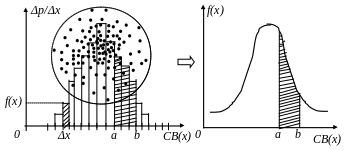 Для небольших интервалов Δx можно считать, что f(x) практически не меняется на этом интервале и можно записать: Δр = f(x)Δx. Пример, изображенный на рис.6 демонстрирует результат построения распределения f(x), где случайной величиной x является координата точки мишени, а вероятность Δр определяется экспериментально частотой, т.е. количеством точек с координатами, попадающими в Δx случайным образом.