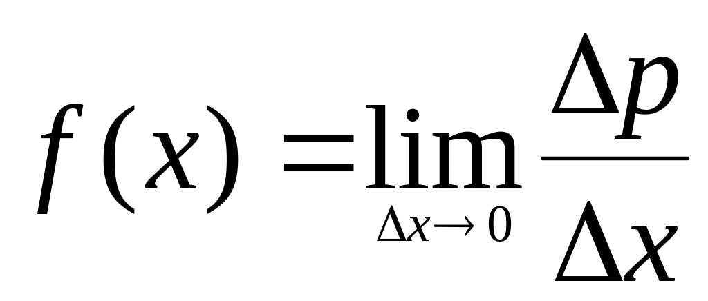 Очевидно, что для непрерывной СВ вероятность появления ее точного значения всегда равна нулю, так как она вычисляется отношением нулевых размеров точки к размерам площади не равной нулю. Поэтому имеет смысл сравнивать размеры хотя бы малой площади или интервала Δx к размерам площади или к размерам оси, соответствующим полной группе событий. Если обозначить Δр – вероятность попадания случайной величины x в интервал ее значений Δx, то можно рассчитать вероятность, соответствующую единичному интервалу значений СВ, т.е. вычислить отношение Δр/Δx. По смыслу, данное отношение является плотностью вероятности, которую обозначим символом функции f(x). Наконец, для детального описания необходимо приблизить границы интервала Δx к точке x. При этом, размеры интервала станут бесконечно малыми, но и соответствующая вероятность попадания СВ в этот интервал станет меньше. Тогда можно найти предел отношения Δр/Δx при Δx → 0, и если такой предел существует, то по смыслу он будет характеризовать плотность вероятности, но уже в точке x, принадлежащей бесконечно малому интервалу dx, что кратко запишем следующим образом: