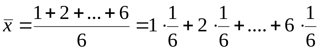 Теперь научимся рассчитывать средние характеристики распределений. Начнем с простого примера. Для того, чтобы вычислить среднее значение СВ, появляющейся в результате бросания игральной кости в форме кубика, очевидно, необходимо просуммировать числа, нанесенные на гранях и разделить на общее число граней. Тогда имеем: