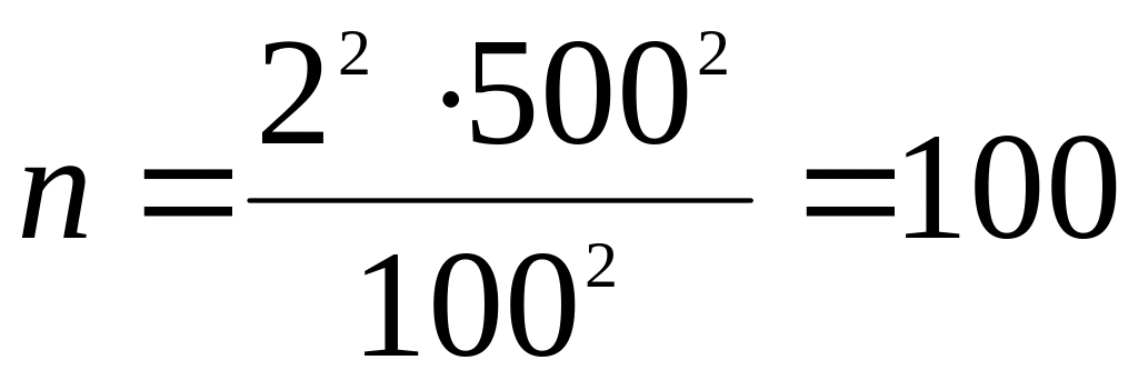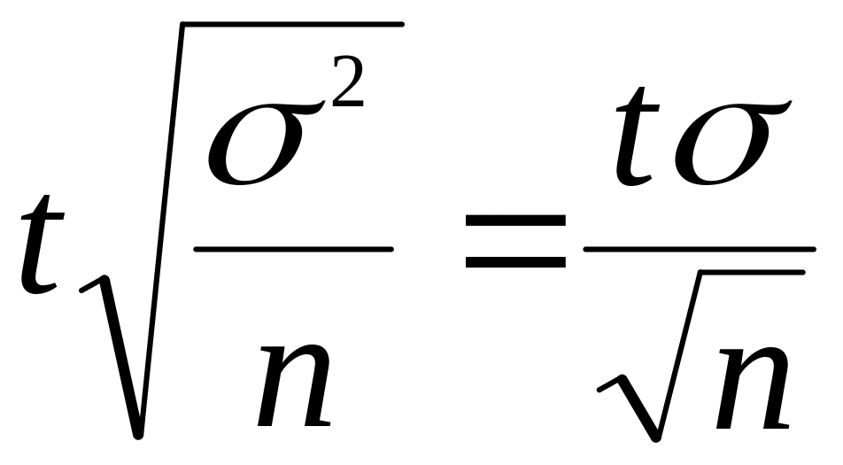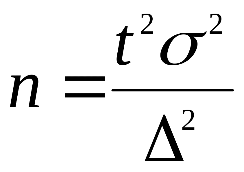 При проведении социально-экономических исследований по определению среднего уровня оплаты труда категории работников коммерческих банков было выяснено, что в выбранном регионе разница между наибольшим и наименьшим уровнем оплаты операционистов оказалась равной 3 тыс. руб. Если считать, что эта величина соответствует разбросу 6σ (от –3σ до +3σ), то оценка величины стандартного отклонения, судя по выборке, составляет 3000 руб./ 6 =500 руб. Для дальнейших расчетов, зададимся предельной ошибкой выборки в 100 руб. Обозначим эту величину Δ. С другой стороны, Δ не превосходит величины доверительного интервала tμ, где μ2=σ2ср; σ2ср = σ2 /n, а n – размер выборки (количество обследованных операционалистов). Тогда можно записать: