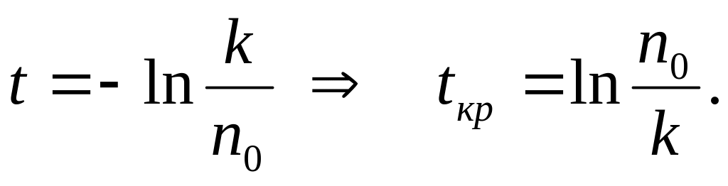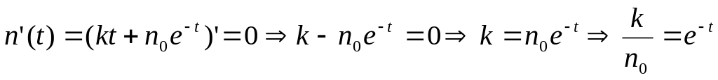 Приведенный расчет показывает, что для построения общей зависимости необходимо складывать значения функций n* = kt и n1 = n0e-t в одинаковые моменты времени. Функция n* отличается от n2 тем, что из значений n2 вычтена константа n0 , а следовательно график функции пройдет через начало координат. Результат сложения (по точкам) приводит к функции, которая имеет минимум. Это означает, что в момент tкр количество здоровых людей будет минимально или количество больных максимально. Этот критический момент можно рассчитать по условию экстремума функции – производная в этой точке обращается в нуль. Поэтому можно записать: