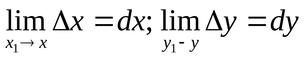 Допустим, что на графике функции y(x) (рис.14) производится предельный переход от точки x1 к точке x. Разность значений аргумента x – x1 =Δx называется приращением аргумента. Таким же образом можно ввести понятие приращения функции Δy = y(x) – y(x1). Тогда предел приращения переменных величин x при стремлении x1 к точке x, и у1 к точке y, если он существует, называется дифференциалом (обозначается dx или dy) в этой точке (от слова differ (англ.) – разность, следовательно дифференциал – бесконечно малая разность):