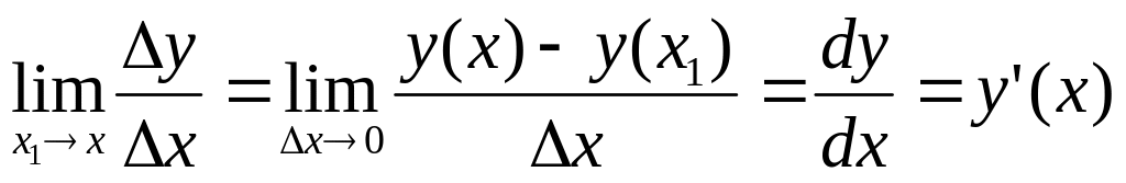 Если для любого x существует предел отношения приращения функции к приращению аргумента, то он равен отношению дифференциалов этих величин, называется производной функции y(x) по переменной x и обозначается со штрихом y’(x) (или в общем случае f’(x)):
