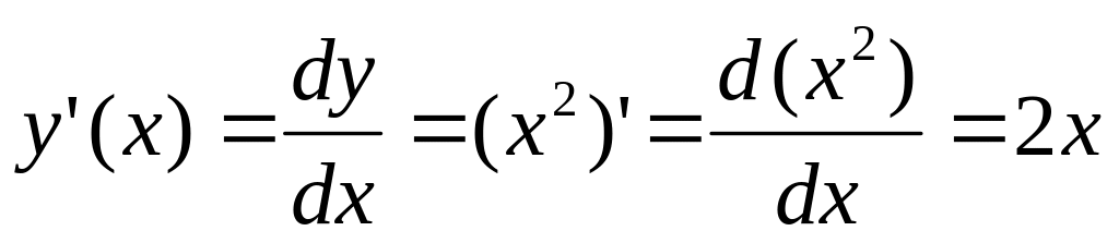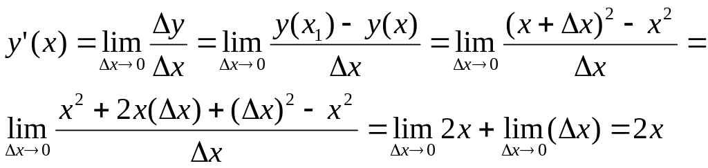 Δx = x1 – x , откуда следует, что x1 = x+ Δx. Приращение функции обозначим Δy = y(x1) – y(x) = x12 – x2. Тогда по определению производной через предел отношения приращений, будем иметь при x1 → x , то есть при Δx→0 :