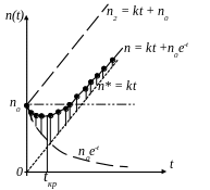n(t) = n2(t) – Δn = kt + n0 – n0 + n0e-t = kt + n0e-t .