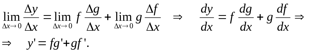 1. Правило дифференцирования произведения двух функций, зависящих от одного и того же аргумента: y(x) = f(x)·g(x) или кратко y = fg. Если функции f(x) и g(x)получили приращение, то и функция y(x) также получила приращение. Тогда можно записать, что y + Δy = ( f +Δf )(g+ +Δg). Выразим отсюда величину Δy: Δy = fg + f Δg + g Δf – fg = f Δg+ + g Δf. Поделим левую и правую часть на приращение аргумента Δx и перейдем к пределам:
