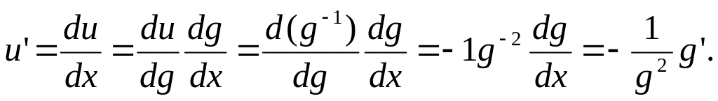 Введем обозначение u = 1/g = g-1. Тогда будем иметь произведение функций y = f u. Используя предыдущее правило, получим: y’ = f’u + u’f. Найдем теперь производную du/dx.