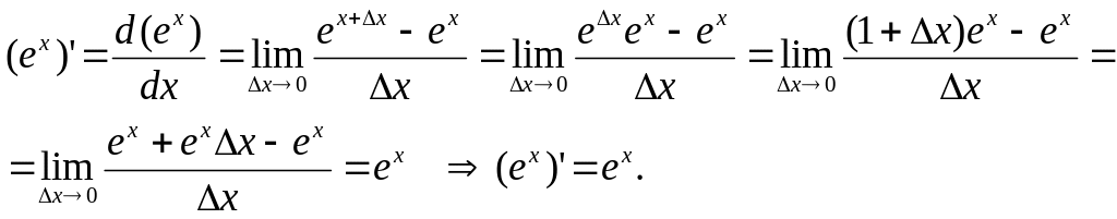 В расчетах использовано разложение экспоненциальной функции в степенной ряд (14) и переход к линейной функции (1+Δx) при малых значениях аргумента Δx. В результате оказалось, что производная от экспоненциальной функции совпадает с самой экспоненциальной функцией.
