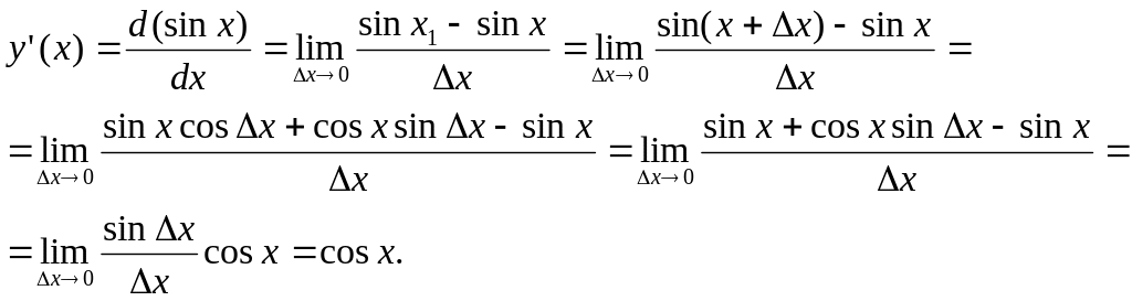 Окончательно получаем, что (sinx)’=cosx. При расчетах использованы соотношения: cosΔx→1 при Δx→0 и второй замечательный предел.
