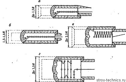 Они эффективно используются экскаваторами, оборудованными обратной лопатой или драглайном.Для экскаваторов с прямой лопатой этот тип забоя затрудняет работу транспортных средств и увеличивает угол поворота на выгрузку грунта до 180°, что снижает его производительность.Лобовые забои в зависимости от ширины проходки делятся на узкие (ширина проходки до 1,5 R; где R — наибольший радиус копания), нормальные (ширина 1,5-1,8 R) и широкие (ширина более 1,8).Узкие котлованы шириной до 1,5 R разрабатывают лобовой проходкой с односторонней погрузкой в транспортные средства (рис. 8.28, а), при ширине 1,5-1,8 R — с двусторонней подачей транспортных средств (рис. 8.28,6).Котлованы шириной 2,0-2,5 R целесообразно разрабатывать уширенной лобовой проходкой с перемещением экскаватора по зигзагу (рис. 8.28, в) с двусторонней или односторонней погрузкой, а при ширине до 3,5 if — поперечно-лобовой проходкой с двусторонней погрузкой грунта в транспортные средства (рис. 8.28, г).При ширине разработки более 3R после первой лобовой проходки по одному из упомянутых выше способов ее следует расширить до необходимого размера последующими проходками боковых забоев.
