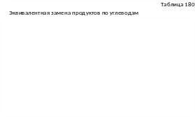 Необходимым условием диетотерапии является фиксированное по времени и количеству распределение углеводов в течение суток в зависимости от получаемого инсулина. По возможности учитывают индивидуальные привычки и особенности питания в семье. Так, при 1-2-кратном введении инсулина пролонгированного действия больной получает углеводы в определенных количествах через 1 ч после инъекции, каждые 2-3 ч в течение 12 ч (периода максимального действия инсулина). Использование инсулина короткого действия (кроме препаратов типа Хумалог) предполагает назначение углеводов через 20-30 мин после введения инсулина. Обычно 1 ЕД инсулина вводят на 12 г съеденных углеводов (этот показатель условно назвали 1 хлебная единица). 12 г углеводов повышают уровень глюкозы в крови на 2,8 ммоль/л. Для упрощения расчетов можно пользоваться таблицей замены углеводов (табл. 180).