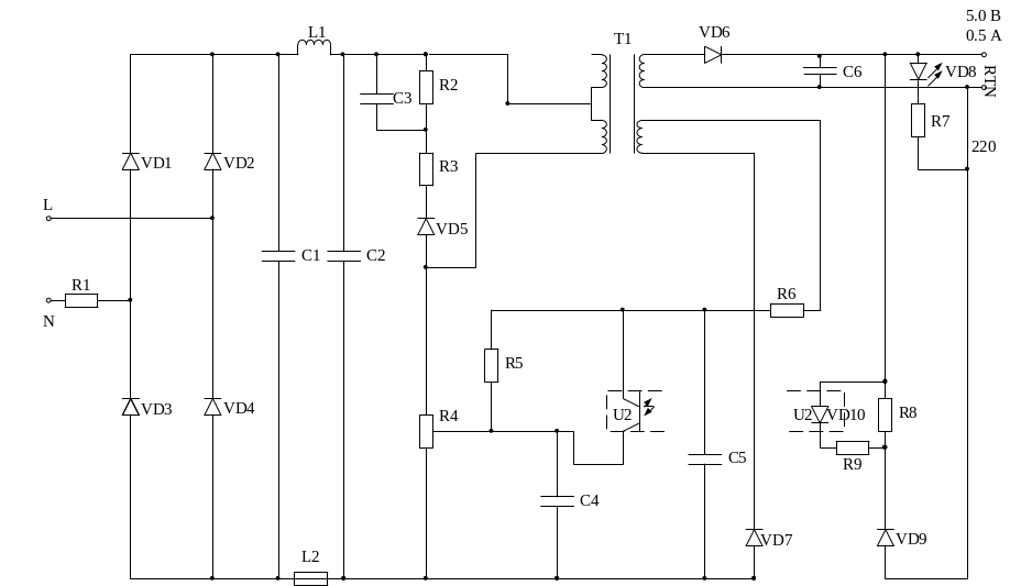 Рисунок - 1 Схема электрическая принципиальная. Теперь более подробно остановимся на элементах схемы: Вставка плавкая RF1 позволяет защитить схему от короткого замыкания. Индуктивности L1 и L2 вместе с конденсаторами С1 и С2 образуют надежный и недорогой фильтр для уменьшения ЭМИ. Фазирование обмоток трансформатора Т1 и диод D7 не позволяют течь току во вторичной обмотке в то время, когда силовой MOSFET транзистор микросхемы U1 находится в открытом состоянии. При этом ток, который течет в первичной обмотке запасает энергию в сердечнике Т1. Когда силовой транзистор в U1 запирается – энергия, запасенная в T1 преобразуется в ток вторичной обмотки, который проходя через D1 заряжает емкость С7, поддерживая напряжение на выходе. Цепочка RDC: С3, D5, R1 и R2 – ограничивает напряжение обратного хода через первичную обмотку в то время, когда силовой транзистор в микросхеме U1 запирается. Обмотка смещения обеспечивает управление микросхемой U1 через специальную ножку C микросхемы U1 (CONTROL pin). В режиме CV ток на выходе контролируется фототранзистором оптопары U2. При запуске микросхемы и в режиме СС, когда оптопара отключена – обратную связь обеспечивает резистор R5. Диод D6 включенный в обмотку смещения выпрямляет ток, делая его пригодным для питания оптопары. Обмотка смещения вместе с дополнительной экранной обмоткой снижают уровень ЭМС. Конденсатор С6 включен на ножку C (Control pin) микросхемы, он запасает энергию и питает микросхему при запуске. Кроме этого он определяет время перезапуска в режиме “рестарт”. Еще конденсатор служит для снятия высокочастотных шумов с ножки С и если нужно обеспечивает – затвор стабильным током управления. Напряжения падающие на VR1, R7 и на светодиоде U2 – определяют выходное напряжение схемы. Резистор R8 обеспечивает ток смещения для VR1.Выходное напряжение может быть настроено более точно путем подбора резисторов R7 и R8.