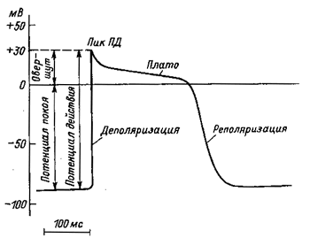 Конечная реполяризация в клетках миокарда обусловлена постепенным уменьшением проницаемости мембраны для кальция и повышением проницаемости для калия. В результате входящий ток кальция уменьшается, а выходящий ток калия возрастает, что обеспечивает быстрое восстановление мембранного потенциала покоя. Длительность потенциала действия кардиомиоцитов составляет 300–400 мс, что соответствует длительности сокращения миокарда (рис. 2).