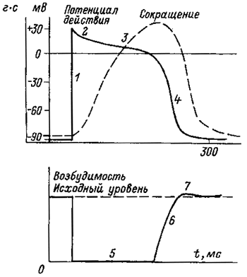 1 – фаза деполяризации; 2 – фаза начальной быстрой реполяризации; 3 – фаза медленной реполяризации (фаза плато); 4 – фаза конечной быстрой реполяризации; 5 – фаза абсолютной рефрактерности; 6 – фаза относительной рефрактерности; 7 – фаза супернормальной возбудимости. Рефрактерность миокарда практически совпадает не только с возбуждением, но и с периодом сокращении