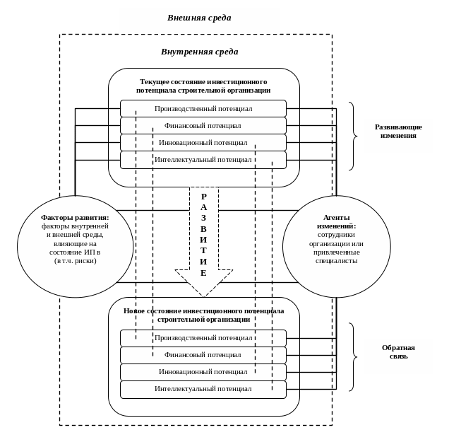 Схема базируется на гармонизации взаимодействия следующих блоков: объект управления (сам ИП, т.е. его текущее состояние, нуждающееся в позитивном развитии), факторы и агенты развития (влияют на текущее состояние потенциала через развивающие изменения), процесс развития (предполагает реализацию намеченных развивающих изменений) и конечные результаты (новое состояние ИП), получаемые при целеориентированном управлении данным процессом.
