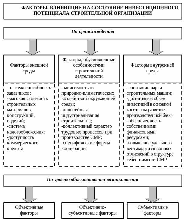 Изучение теоретических основ формирования и функционирования ИП организаций регионального ИСК позволило выявить и привести в определенную систему факторы, влияющие на его состояние. Ранее существующие систематизации базировались на выделении следующих классификационных признаков: среда формирования (внутренняя и внешняя), особенности строительства как вида деятельности (зависимость от природно-климатических воздействий окружающей среды; коллективный характер трудовых процессов при производстве СМР; специфические формы кооперации). С точки зрения достижения целей нашего исследования представляется необходимым и целесообразным введение в систему еще одного классификационного признака, а именно, признака объективности возникновения действия отдельного фактора или их группы.