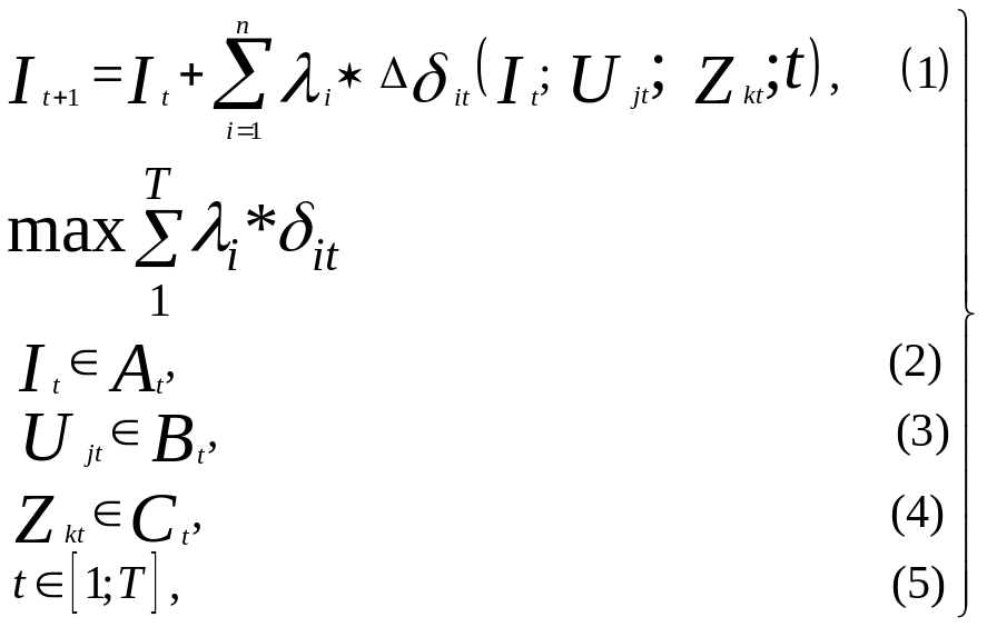 Уравнение (1) в модели (3) представляет собой функциональную зависимость нового состояния ИП строительной организации от его текущего состояния, развивающих изменений, факторов развития, времени. Выражения (2)-(4) в этой модели являются математической формулировкой ограничений.