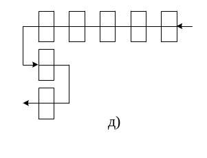 Станы подразделяются на последовательные(а); линейные(б); непрерывные(в); полунепрерывные(г); зигзагообразные(д).