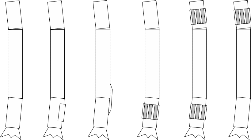 Рис. № 12 Забойные двигатели с двумя перекосами в компоновках для набора параметров кривизны а - забойные двигатели с двумя перекосами, б и в - забойные двигатели с двумя перекосами и накладками, г и е - забойные двигатели с двумя перекосами и одним центратором, д - забойные двигатели с двумя перекосами и двумя центраторами