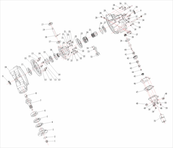 1.Гайки с фланцем M12X1.25 2.Шайба 12 3.Соединение передней оси 4.Сальник FB45X68X8 5.Гайка самоконтрящаяся 6.Подшипник 6305 7.Шестерня 8.Игольчатые подшипники NA5903 9.Сальник FB25X40X7 10.Картер левой передней оси 11.Подшипник 6008 12.Ведомая шестерня передней оси 13.Магниты 14.Регулировочная шайба φ54xφ66 15.Левая выходная шестерня 16.Правая выходная шестерня 17.Маленькая коническая шестерня 18.Вал шестерни 19.Цилиндрический штифт 4x30 20.Картер редуктора 21.Пружинная шайба 10 22.Болт M10X1.25X20 23.Подшипник 61913 24.Скользящая муфта 25.Выходные шестерни 26.Стопорное кольцо 62 27.Подшипник 16007 28.Винт с внутр. шестигр. M5X15 29.Передняя ось с корпусом 30.Болт M18X25 31.Датчик скорости 32.Болт-пробка 33.Винты с внутр. шестигр. M12x10 34.Направляющая 35.Болт M10x1.25x12 36.Медная прокладка 10.5 37.Контактные детали 38.Внешняя шестерня 39.Внешние крепления 40. Стержень 41. Торсионная пружина 42. Внутренние шестерни 43.Направляющие 44.Медные втулки 45.Шестерня 46.Дно 47.Прокладка 48.Шпилька 49.Крышка 50 .Болты с фланцем M6X20 51.Двигатель 52.Вилка 53.Проволочная пружина 54.Шарφ4