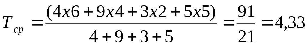 Пример. В производственном процессе предприятие использует четыре вида оборудования А, Б, В, Г, количество каждого вида соответственно 4, 9, 3, 5. Сроки эксплуатации оборудования: А - 6 лет, Б - 4 года, В - 2 года, Г - 5 лет. Средний срок оборудования составит: