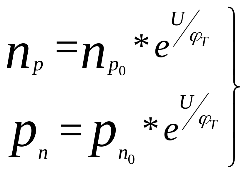Изменение высоты потенциального барьера при прямом и обратном смещениях p-n перехода сопровождается изменением граничных концентраций неосновных носителей заряда в слоях полупроводника, прилегающих к границам перехода и рассчитываются по формуле: