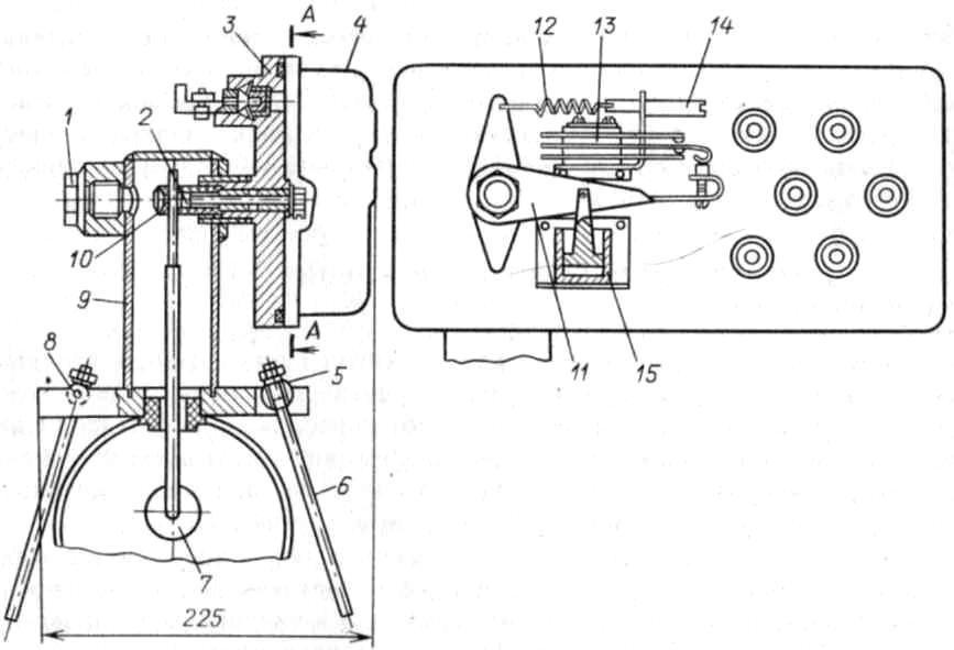 Реле производительности РПФВ-1К (рис. 2) состоит из корпуса 9 и платы 3. В верхней части корпуса имеются два отверстия: одно для ввода валика 2, второе, заглушённое пробкой 1, для ключа под специальную гайку 10, крепящую шток с резиновым флажком 7. Нижняя часть корпуса представляет собой плиту с двумя проушинами для поворотных валиков 5, с помощью которых шпильками 6, 8 реле укрепляется на трубопроводе. Крышка 4 закрывает рабочую камеру реле, в которой размещена контактная группа 13. При воздействии потока жидкости на флажок 7 поворачивается жестко связанный с ним валик 2 и рычаг 11, переключающий контактную группу 13. Изменяя предварительное натяжение пружины 12 с помощью винта 14, можно настроить реле на срабатывание при определенной скорости потока жидкости. При снижении скорости жидкости в трубопроводе флажок под действием пружины возвратится в исходное положение и, следовательно, замкнутся или разомкнутся электрические цепи. Демпфер 15 предназначен для замедления колебаний подвижной системы реле.