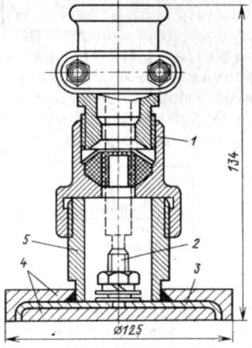 Для контроля температуры подшипников в насосных установках обычно применяют термодатчики ТДЛ-2 (рис.4). Принцип действия датчиков основан на использовании сплава, температура плавления которого 70-72 °С. При перегреве подшипника сплав 5 в наконечнике датчика расплавляется и освобождает валик 4, который под действием пружины 3 поворачивается и переключает контактную систему 2. После каждого срабатывания датчика возврат его в исходное рабочее положение производится вручную рукояткой 1.