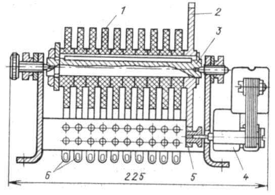 Программу работы автоматизированной водоотливной установки обычно задает моторное реле времени — моторный коммутатор. Реле (рис.5) состоит из синхронного двигателя 4 типа СД-2, зубчатой пары 2, 5 и до десяти контактных дисков 1, воздействующих на контактные группы 6. Диски, набранные на оси 3, при вращении производят переключения контактов.