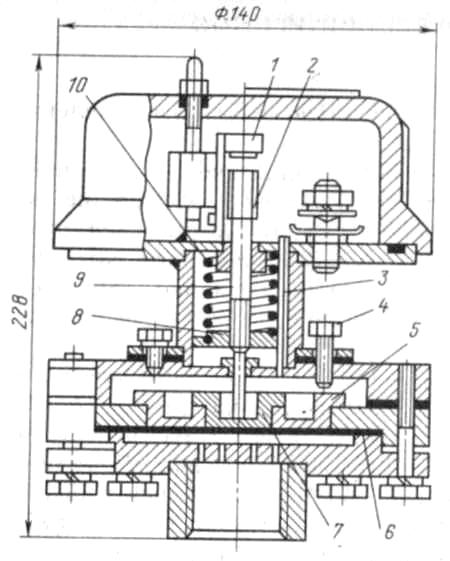 Для контроля заливки насосов используются реле давления РДВ (рис. 3). Чувствительным элементом реле давления является диафрагма 6. Реле имеет две ступени регулировки срабатывания по давлению. Выбор ступени осуществляется при введении в действие с помощью винта 4 малого поршня 7 или малого и большого 5 поршней вместе, что соответствует уменьшению или увеличению рабочей площади диафрагмы. Сила давления воды, воспринимаемая диафрагмой, передается через поршень на шток 9, который воздействует на микропереключатель 1. Предварительное натяжение пружины 10, необходимое для четкого срабатывания реле, регулируется штоком 9, в верхней части которого имеется участок шестигранного сечения. При регулировке шток ввинчивают в специальную гайку 8. Последняя фиксируется шпилькой 3. Зазор между штоком и микропереключателем устанавливается регулировочной гайкой 2.