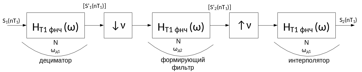 В этой схеме на ФНЧ1, стоящей в дециматоре, не накладываются высокие требования к прямоугольности АЧХ. Он должен обеспечить граничную частоту соответствующую частоте дискретизации.