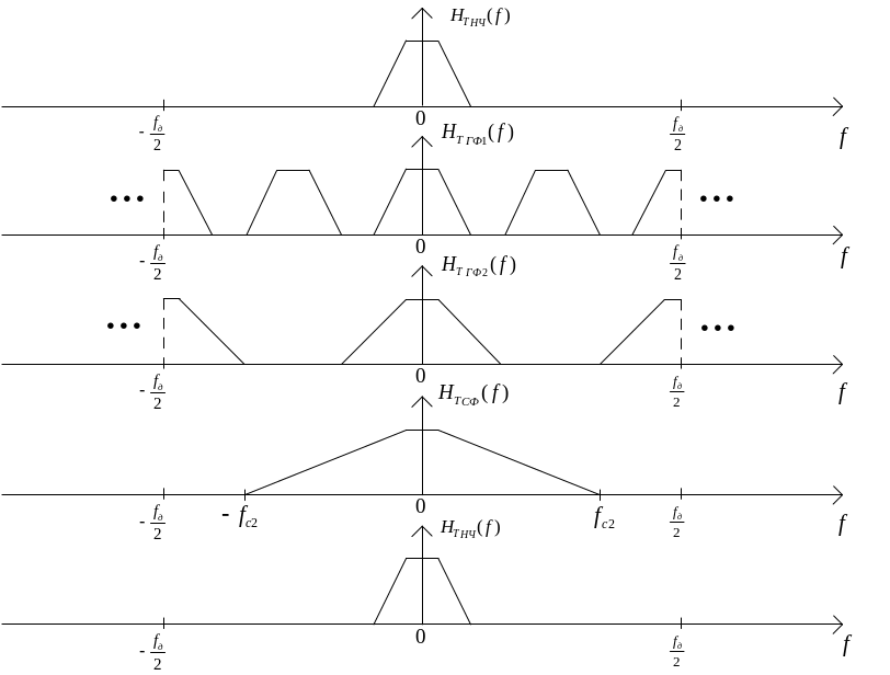 Если этого недостаточно, то возможна так называемая трехкаскадная схема построения узкополосного фильтра, когда ЦСФ реализуется путем последовательного соединения вспомогательного (дополнительного) ГФ и выходного СФ.