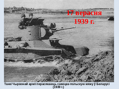 граніцу польскай дзяржавы і пачалі паход у Заходнюю Беларусь і Заходнюю Украіну (слайд №6). Паход Чырвонай Арміі працягваўся 12 дзён, у выніку яго заходняя мяжа СССР была аднесена на 200 – 300 км і ў асноўным супала з “лініяй Керзана”. Да Савецкага Саюза адышлі тэрыторыі, якія былі заняты Польшчай па выніках Рыжскага мірнага дагавора 1921 г. Уз’яднанне народаў Украіны і Беларусі з’явілася актам гістарычнай справядлівасці.