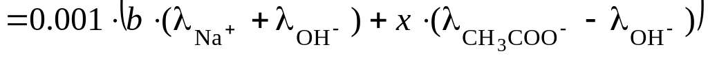 где [Na+], [ОН–], [СН3СОО–] – концентрации, моль/л, λNa+, λОН–, λСН3СОО– – эквивалентные электропроводности ионов, См·см2/моль. Если суммарная концентрация ионов невелика, то можно считать, что эквивалентные электропроводности ионов λi постоянны и равны эквивалентным электропроводностям в бесконечно разбавленном растворе λ°i. Тогда изменение удельной электропроводимости раствора обусловлено лишь изменением концентрации ионов за счёт реакции.