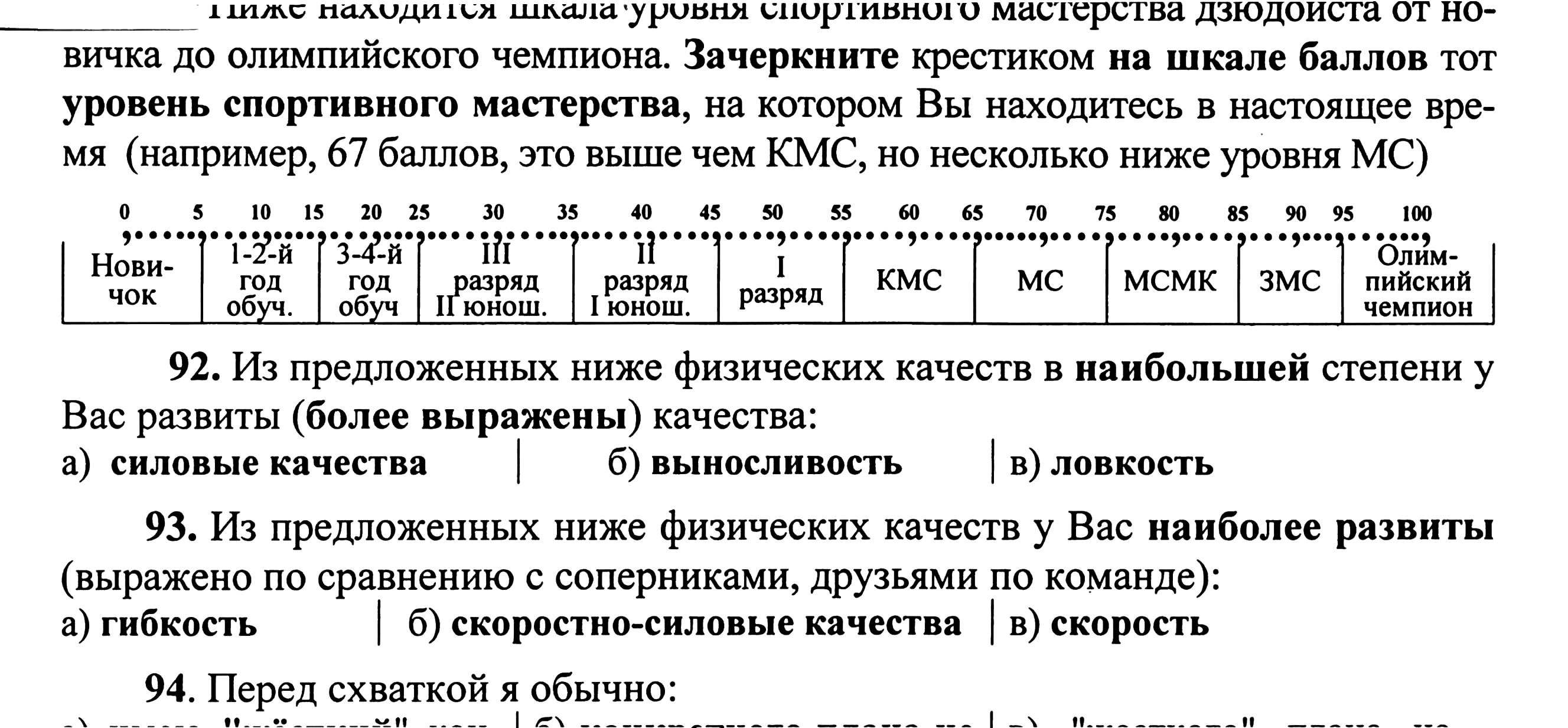 Ниже находится шкала уровня спортивного мастерства студента от новичка до олимпийского чемпиона в баллах. Зачеркните крестиком на шкале тот уровень спортивного мастерства, на котором Вы находитесь в настоящее время (например, 67 баллов, это выше чем КМС, но несколько ниже уровня МС), если не занимались спортом, то 0 баллов.