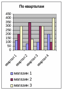 Задание 2. Для трех магазинов известны поквартальные прибыли. Создать таблицу полученных доходов магазинов поквартально. Найти среднемесячную прибыль для каждого магазина. Построить круговую диаграмму «Среднемесячная прибыль» и две столбчатые диаграммы «По кварталам», «По магазинам»: