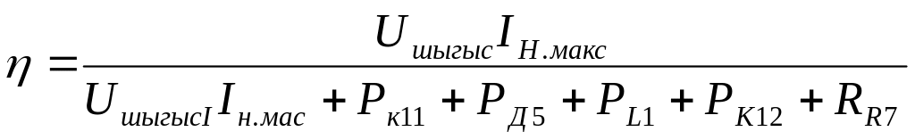 мұндағы UL1=(0,02÷0,1) Uшығ - дроссельдің белсенді кедергісіндегі кернеудің түсуі; Uк э 11 қан - T11 транзисторының қанығу режиміндегі коллектор-эмиттер ауысу кернеуі; UR7 – R7 кедергісіндегі кернеудің төмендеуі; U01м1 – тұрақтандырғыш кірісіндегі лүпілдеуіш амплитудасы; U01мu - T11 транзистор тогының импульсті өзгеру есебінде тұрақтандырғыш кірісіндегі лүпілдеуіш амплитуда.