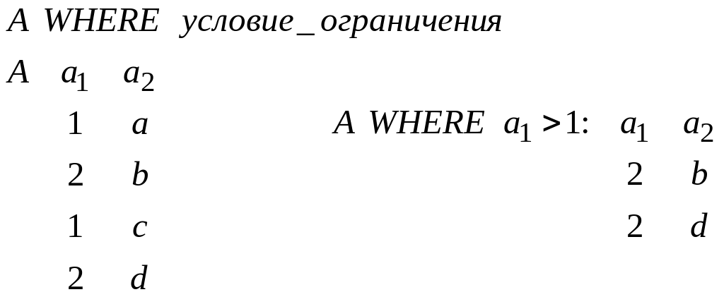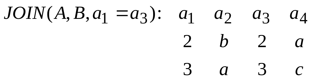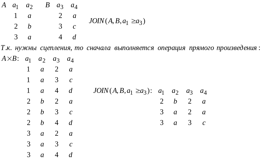 Результатом соединения будет отношение, в котором кортежи являются сцеплением кортежей первого и второго отношений именно таких, которые удовлетворяют условию.