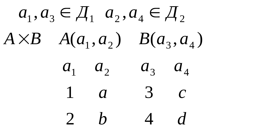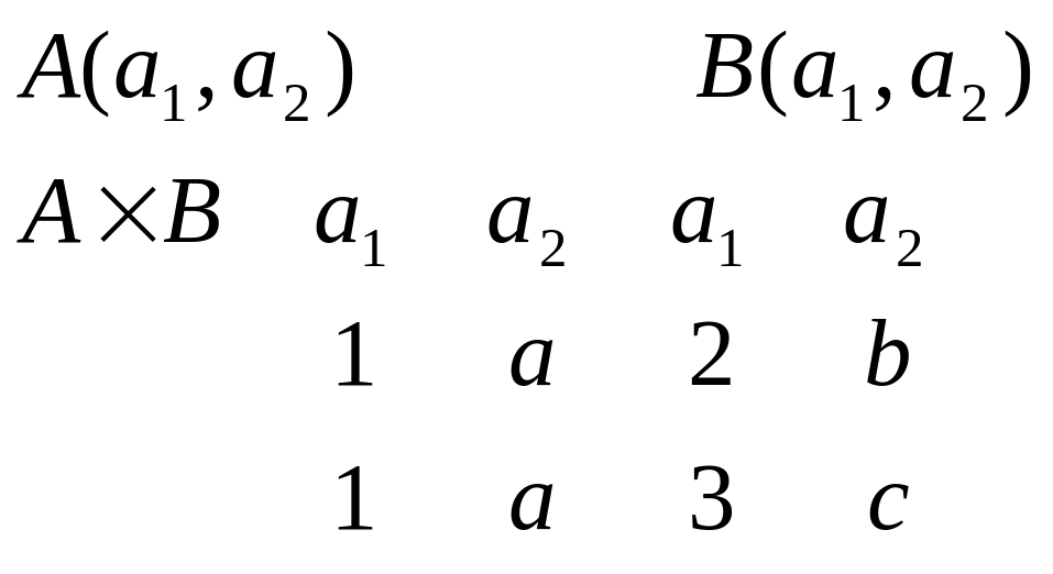 Прямое произведение двух отношений – отношение, кортежи которых являются сцеплением (конкатенацией) кортежей первого и второго отношений.