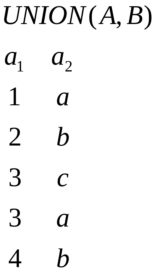 Объединение двух отношений – отношение, включающее все кортежи, входящие хотя бы в одно из объединяемых отношений.