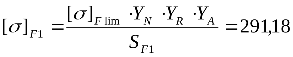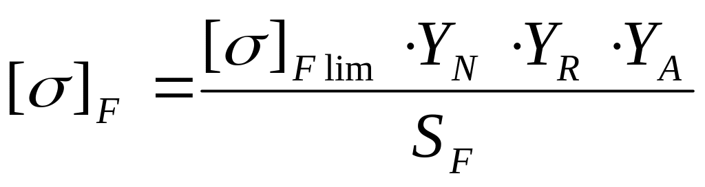 Допускаемые напряжения изгиба зубьев шестерни [σ]F1 и колеса [σ]F2 определяют по общей зависимости (но с подстановкой соответствующих параметров для шестерни и колеса), учитывая влияние на сопротивление усталости при изгибе долговечности (ресурса), шероховатости поверхности поверхностями (переходной поверхности между смежными зубьями) и реверса (двустороннего приложения) нагрузки: