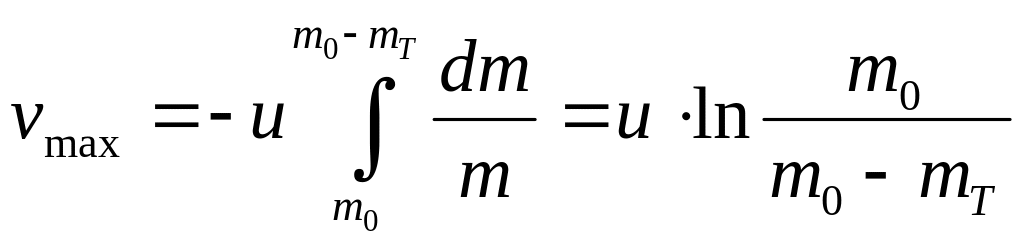 Если m0 – стартовая масса ракеты, а mТ – масса топлива, то максимальная скорость ракеты может быть найдена путем интегрирования:
