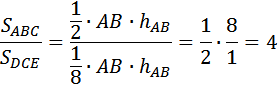 В данной задаче ненужно находить ни длины оснований треугольников, ни высоты. Вычислим, во сколько раз площадь треугольника DCE меньше площади треугольника ABC