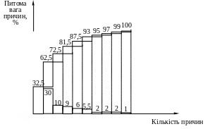 Побудувати графік залежності питомої ваги причин і їх кількості.