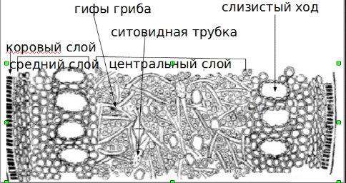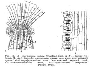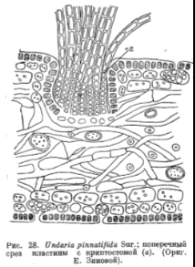 3) Самая сложная дифференциация. Особенно развита она у фукусовых и особенно ламинариевых. Таллом может иметь несколько слоёв: верхний делящийся слой коры – меристодерма, промежуточный слой коры, внутренний слой коры, сердцевина с ситовидными трубками, секреторными клетками в особых каналах, гифами, к тому же выполняющая механические функции (имеет волоконца).
