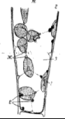 Рис 3. Физоды в поверхностных клетках. Рис 4. Флороглюцин.6) Чередование поколений спорофита и гаметофита (исключение — представители порядка Фукальные), зигота и спорофит 2n. Цикл у большинства гетероморфен — спорофит макроскопический (например, пластинчатая форма ламинарии), а гаметофит микроскопический. У фукуса гаметофит вырастает прямо на спорофите.