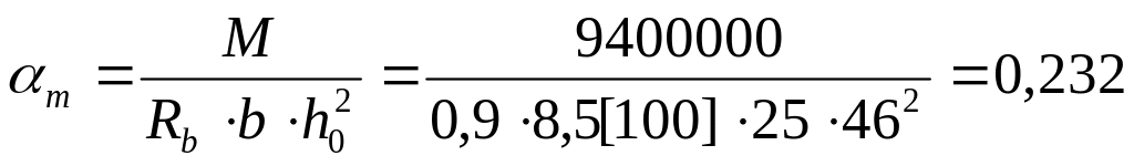 Высоту сечения балки подбираем по опорному моменту при = 0,35, т.к. на опоре момент определён с учётом образования пластического шарнира. При = 0,35 m = 0,289. На опоре момент отрицательный – полка ребра в растянутой зоне, сечение работает как прямоугольное с шириной ребра b = 25 см.